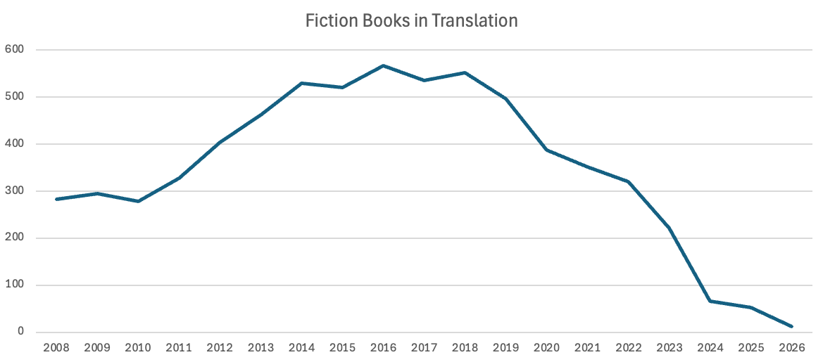 Nor did they really have a well-defined denominator. Counting the total number of books is slippery—should one include self-published or not? are we talking all books or just works of fiction? what do foreign language textbooks show up as? is manga included?—and depending on how many titles a year we use as the base, it’s almost impossible to imagine the number of translations increasing enough to significantly alter that 3% figure. Especially if you assume the total number of published books increases year over year. If there are 230,000 titles one year, and then 240,000 the next, you would have to go from 6,900 translations to 12,000 to move the needle from 3% to 5%. Which is why I’ve been trying for years to move off the idea of the percentage as a benchmark, and instead focus on the actual, individual books that are being published.