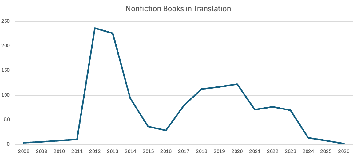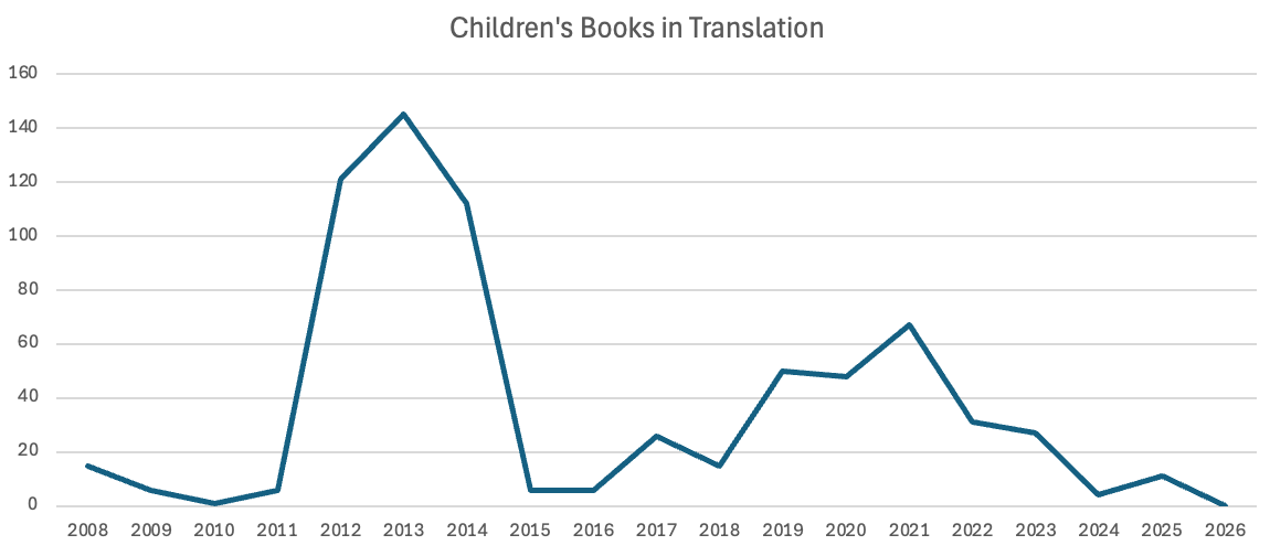 When I initially started tracking translations, I only focused on fiction and poetry, since we all need boundaries. But around 2014, the Italian government asked me to put together a report on the state of Italian literature in translation, and to get a fuller picture of what was going on, I started gathering data about nonfiction and children’s titles, going back a few years to provide a bit more context.