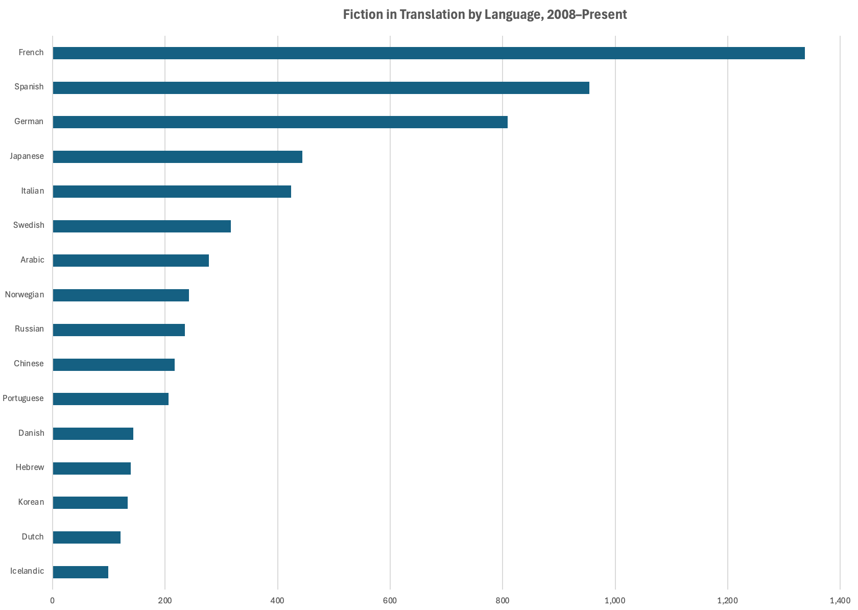 That’s not the most readable chart you’ll see on the Internet today, so here, a bit more plainly, are the top ten most translated languages for fiction published since 2008: