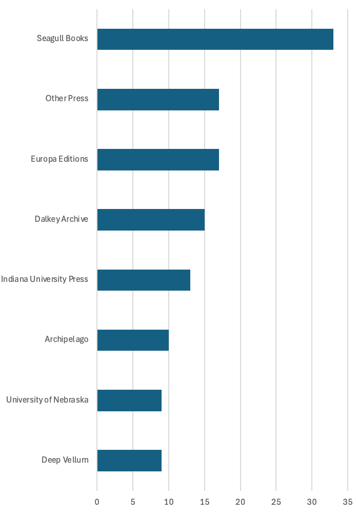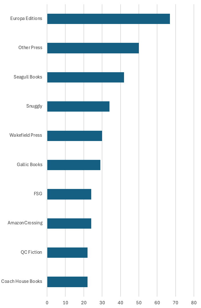 Here’s an updated breakdown of biggest presses for French fiction in translation over the past decade: