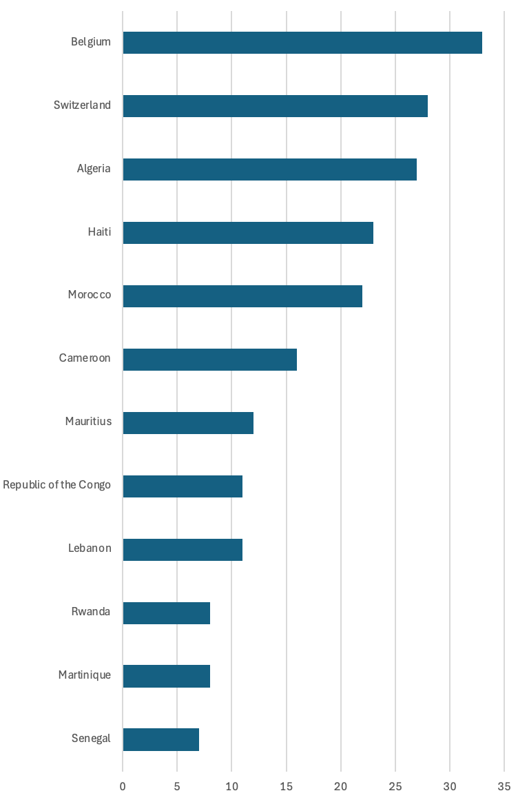 It’s not necessarily surprising that Belgium and Switzerland are on top of this list, but to be completely honest, those weren’t the countries I had in mind when I started parsing this data. But it does explain why Dalkey Archive ranked so high . . . Although they’ve done one book each from Tunisia (Talismano by Abdelwahab Meddeb, tr. Jane Kuntz), Algeria (Confessions of a Madman by Leïla Sebbar, tr. Rachel Crovello), and Canada (Atavisms by Raymond Bock, tr. Pablo Strauss) the other 63 French books from Dalkey Archive in the Database are written by European-born French authors.