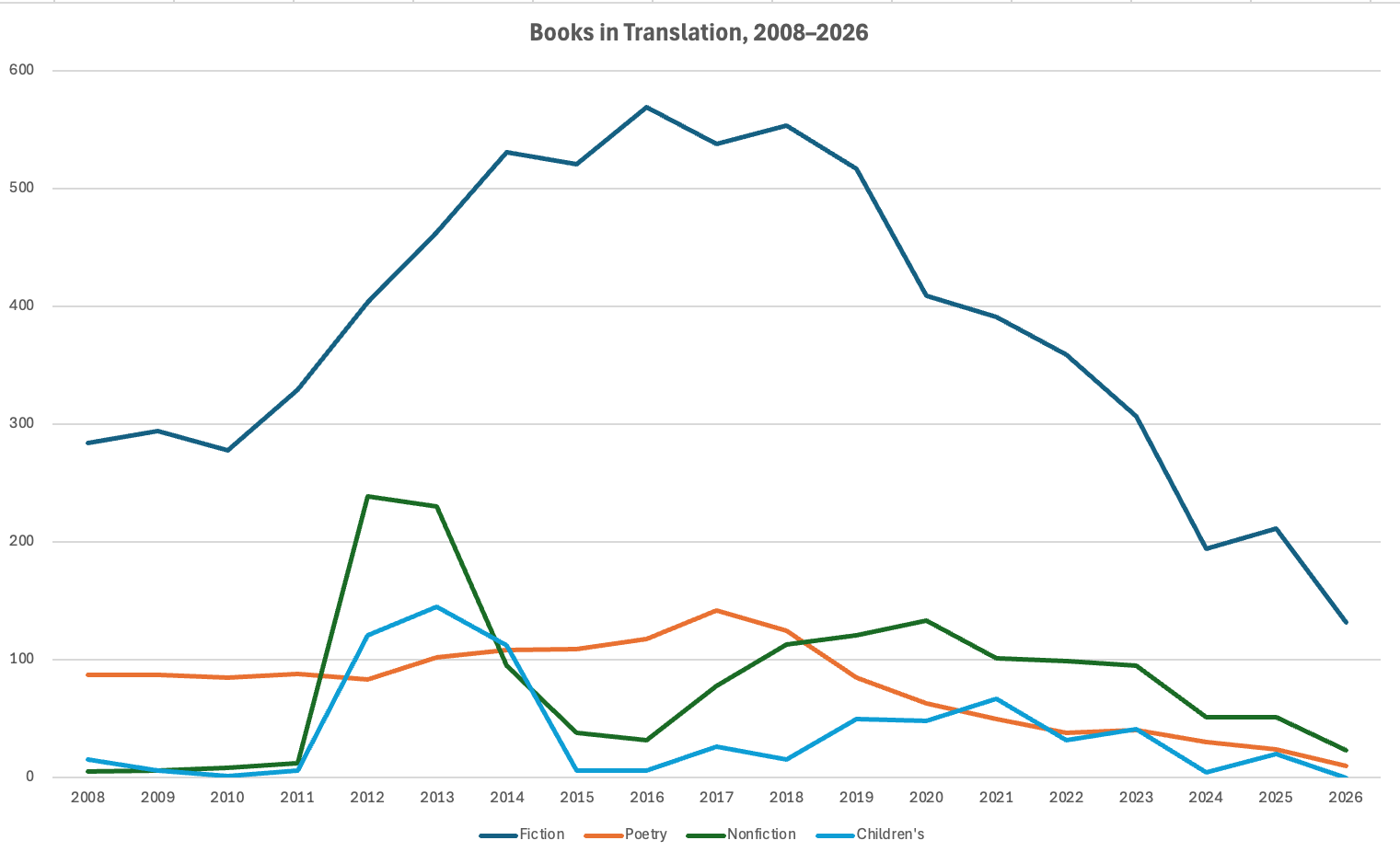 Although I wouldn’t be shocked if the number of publications of literature in translation truly did dip post-pandemic, this is rather extreme. A good chunk of it is probably because, prior to 2020, I relied heavily on physical books arriving in my office from presses whose books weren’t always reviewed in Publishers Weekly, or whatever. At the time everything in the Translation Database was eligible for the Best Translated Book Award, but when that went on hiatus, the number of daily packages petered out.1