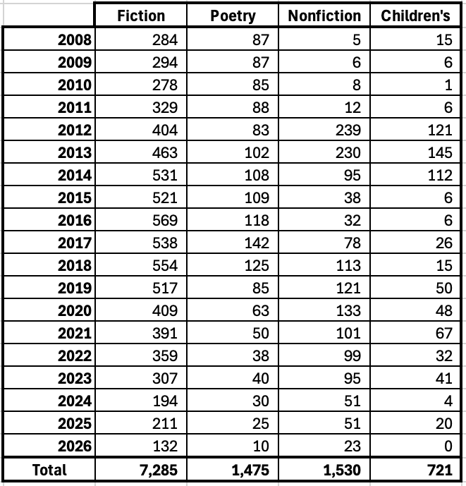 Since the last time I posted about the Database, I’ve added 728 titles from a range of publishers and sources. (Special shout out to Anna Muenchrath for her spreadsheet, which got me jumpstarted.) Sure, there are more books to be added—I have maybe 100 issues of Publishers Weekly to work my way through, and, as usual, I started with the indies like NYRB, Europa, Seagull, etc., so the Big Five is probably unrepresented (awwww, poor them!), and I still haven’t gotten to books distributed by Asterism (which’ll pump the poetry numbers significantly), but on the whole, we now have a pretty nice set of data to poke around in. And by looking at it as a whole I now know where to start to square up the years and genres that seem incomplete.