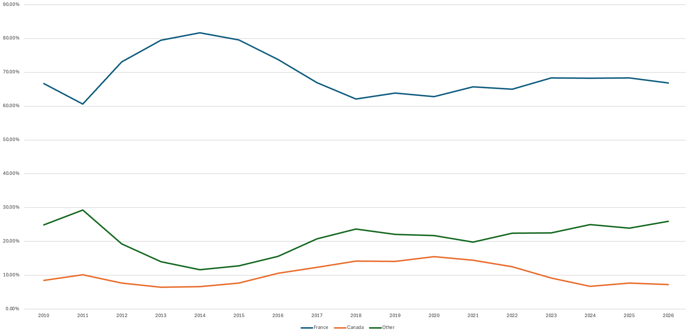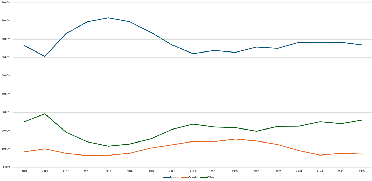 To figure this out, I’ve separated all French books in the database (fiction, nonfiction, poetry, children’s books) into three groups based on the author’s birth country: France, Canada, and Other. Pretty self-explanatory. The chart below is the percentage of French titles from each of those categories, by year, from 2008 through 2025 on a 3-year rolling average, which smooths out the extremes due to the small numbers of it all.